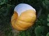 899 McWilliams (selfed 1928 Globus). Our attempt for a big white pumpkin. Looking back at the diary, this one got hammered by hail in June, had bad vine splits. It had potential to get much bigger. We will see what the seed does.