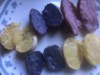 top row L - R honeysuckle gold (yellow flesh. aka the diabetic potato), purple majesty purple flesh, terra rosa (red flesh). bottom L - R adirondack blue(blue flesh), german butterball (white flesh). All the potatoes are tasty but the white are the least tasty. Not bad as there are a lot of bland white flesh (round white for 1)potatoes out there. Color depends on growing temperature plus how you cook them. Even mashed they are still colourful Have other varieties such as the ama rosa fingerling. . I found the german butterball likes to produce. Gotta have fun with your food!