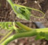 The 1007.5* squash and (yes, you guess right...) next to it the culled b/u. The 1007.5* plant looks horribly unsymmetric, and that�s true. At the 3rd leaf node the main vine made a turn to the right (at a 90 deg. angle) and it took quite a while to get the main back into the desired growth direction. Even more worse it gets by some bad secondaries, which were meant to belong to the left side but were so rigid and wanted to grow to the right side. It will take a while to get that plant into shape, but I�m confident it�s worth it. It�s not a beauty, but a beast........