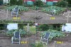There's not very much going on in the patch right now, but I love my wind protection, which looks particularly nice this year, so, I will tell you about it today. As my patch is located in a valley surrounded by some rather bare hills, cold air comes flowing down the valley at night, and my patch is located at a rather exposed site. Therefore, I've found frost damage in early June in some years, and this year there was some frost damage as early as around August 24th. So, the wind protection is not meant to save the plants from stron gusts, it is meant to pose a hindrance to the cold air flow near the ground. Therefore, I had sown rye and vetch last fall (along the fence around the patch), and that green/purple protector was up in May and early June (when I needed it), cf. pic A, June 11th. Around mid June I chopped it down and (instead of corn, which I used to sow in past years) I planted Zinnias, Tagetes 'Single Gold', and put some corn and sunflower seeds into the ground as well (cf. pics B', B'' from July 1st). Now, the time has come that there's risk of frosty airflow again, but thanks to the flowery fence around my patch (pic C, taken yesterday) the frosty air flow gets disturbed about 5 ft before the patch.