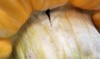 Yesterday I decided to lengthen the slit by about 1/2". The fine line past the crack is the new cut. It's definitely widening as the pumpkin is growing.