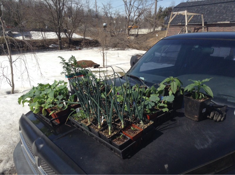 The plants enjoying some long awaited spring sunshine. The snow covered patch is in the background. Pictured is giant amaranth, heavy beets, heavy carrots, rutabaga, onion, kohlrabi, heavy peppers. I've no luck with the cabbage this year, for some reason they look fine until transplanted, then after a couple weeks they rot and die. Other cruciferous plants seem fine.