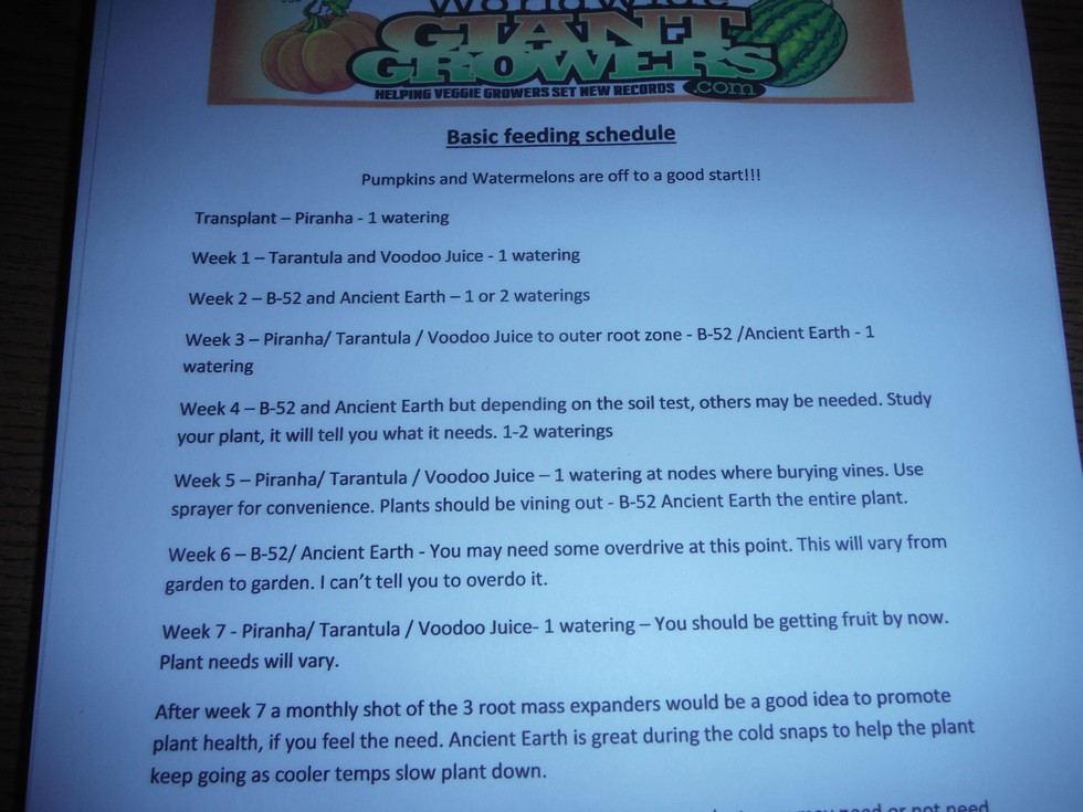 Heres the feeding Schedule to get plants growing.I have had a few e-mails on how much to water each plant.You want to water the root zone of the plant.These beneficials react with the root system no need of getting it 5 feet in front of the plant.Just the present roots.So a small plant maybe a Qt or liter of water,bigger plant 1 gallon or 4 liters and so on.When the plant is 3 feet long I will mix a 5 gallon pail & water a 360 degree circle around plant about mid may!Any Questions call 1 -800 Bubba-Kin lol JK 248=818-0104 or e-mail [email protected]