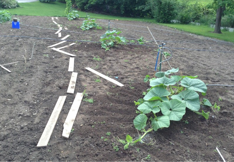 Way overdue for an update. Here's an overview of the pumpkin patch. Four plants total, three are mine, one is our daughters.