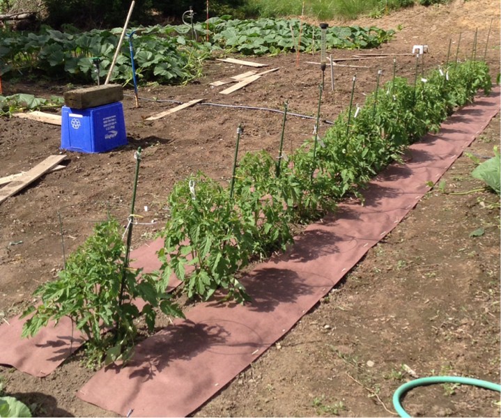 Trying something different with the giant tomatoes this year. I'm using biodegradable paper mulch impregnated with fertilizer. Hopefully this will cut down on disease from soil splashing up and provide a steady feed as it degrades. I have 16 plants in cages and 10 on the other side of the garden growing on the ground on the paper mulch. Not sure if it's the weather or just really good seed lines I'm using this year but almost every plant has a mega-mega bloom showing.