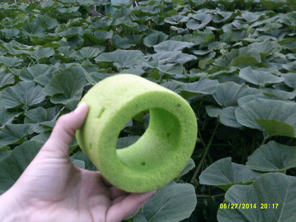 this is my blossum ring . the idea is to create a void where the blossum nub is and make it so it does not rest on the ground(for fear of rot),i used a extra large pool noodle cut to about 5 inches long. i also cut a few holes in it to allow air to get flow through as long as it can.