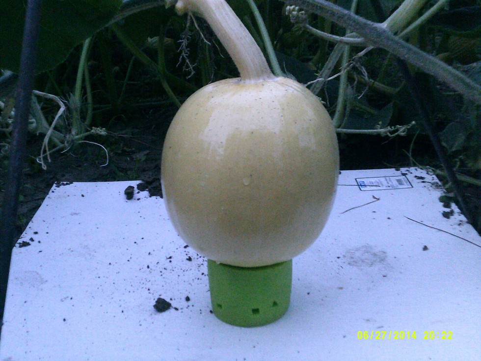 and here is the end result.i cut about 2 nodes loose on each side of the fruit to allow me to raise the vine enough to get it set up.i will be adding a lot of sand around the ring as it grows and eventually will actually support the kin with the sand.the white "board" that its on is frp(fiberglass reinforced panel), aka, shower surround board. my thinking is that the white will reflect sunlight back up and help color in the bottom some, we'll see about that in a couple months.anyway, i hope this explains the process and i'll post updates on it as the fruit grows.