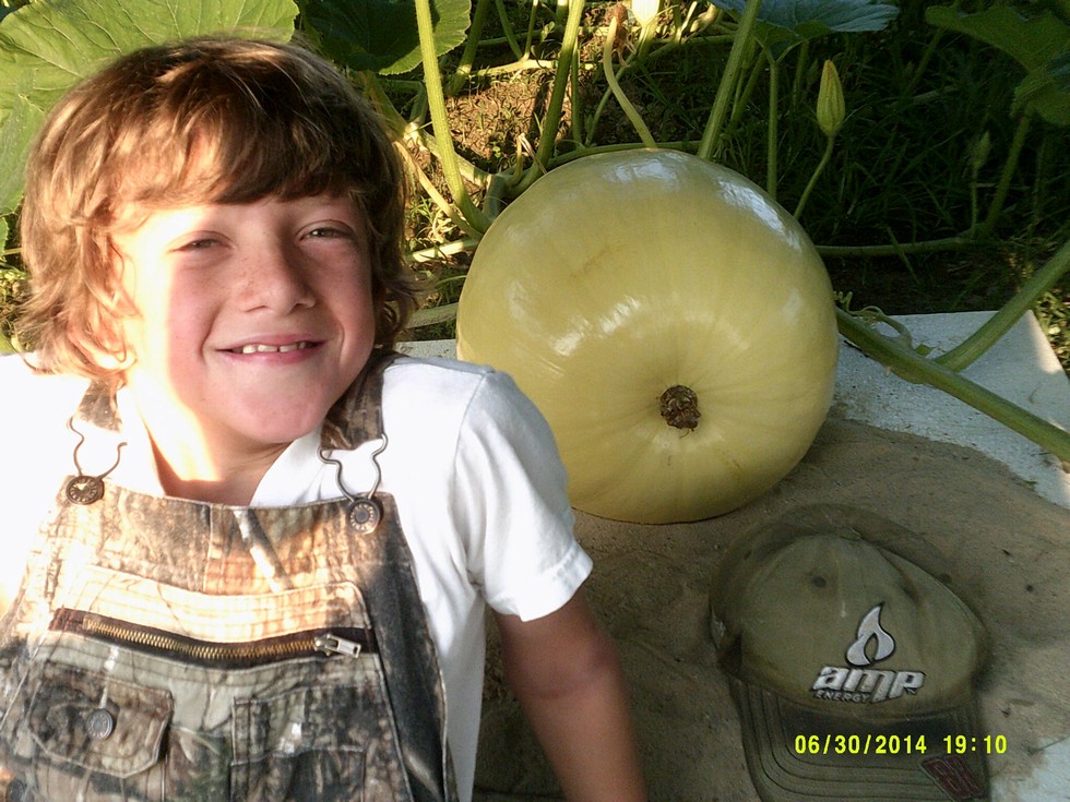 tj and his 2009 fruit at 9 dap.nice shape and a very shiney pumpkin.i think he likes it just a little bit.