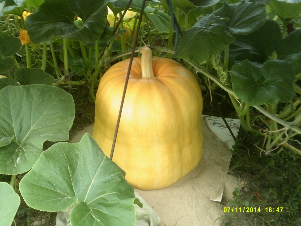 here is a pic of my "project" pumpkin this year,lol.it is a 377 zunino fruit growing on its blossum end , just like its mom was.if it holds and keeps growing, it should be a looker, the nice orange is starting to come in around the stem and entire pumpkin is darkening up nicely.have not measured it but i would geuss around 125 poundsor a bit more maybe, and growing decent, hope to get it somewhere around 300 or better but only on about 125 sq. ft.of vines, all sides, lost main at about 5 feet and used what sides were left.pretty cool to look at growing this way though.