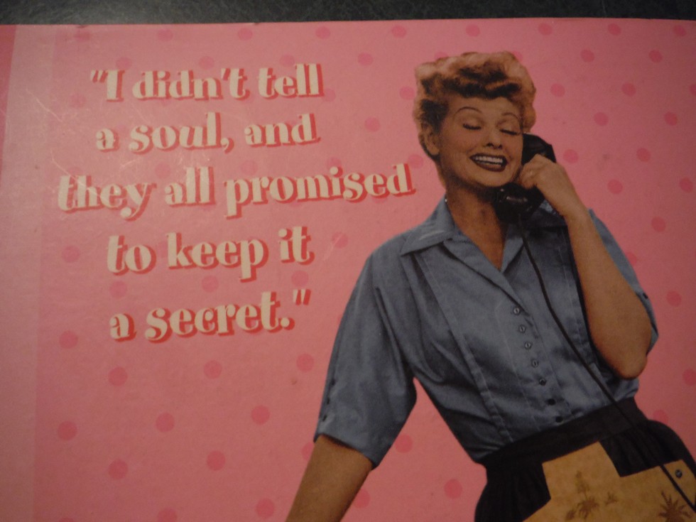 Nobody can keep a secret.If you tell 1 person the cat is off and running.LOL SHHHHHHHHHHH!!!!!Keep it a secret but go tell a friend