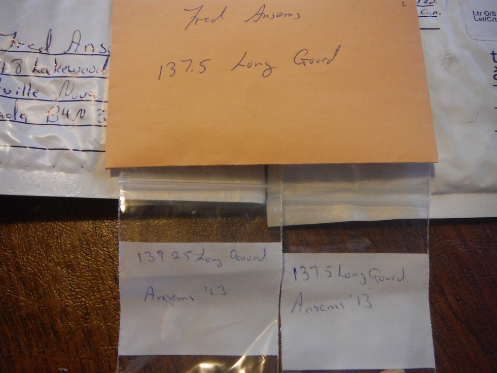 Wow! Another great Christmas gift came today!The mother of the 138.5 Clementz & the WR long gourd.I will add a couple of these to the WWGG long gourd free raffle for 2015 also.Cant wait to grow the 137.5 again.Thanks Fred & Merry Christmas. I will send you back a nice surprise.