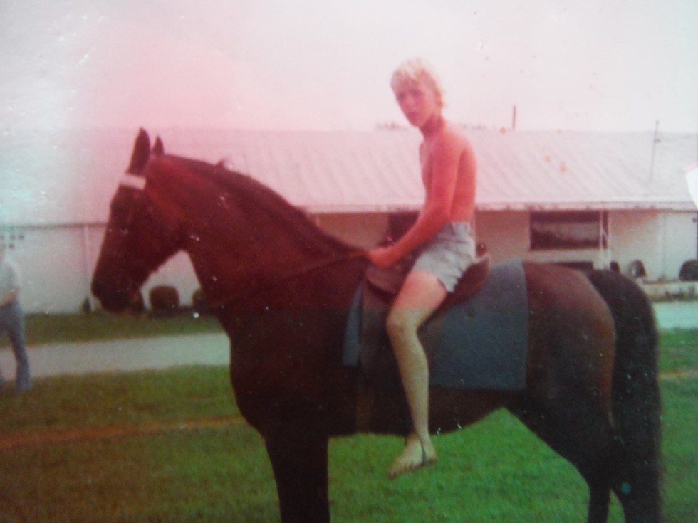 Heres me in my younger days.This was about 10 days after we lost Elvis in 1977.Im sitting on a World Champion Tennessee Walking horse Ebonys True Grit.My Aunt took us every August to Shelbyville to see the World Championship.I know what you ladies are thinking.Look at the guns on him! A natural blonde to boot!lol Thanks Aunt Carol We had a good time!!!