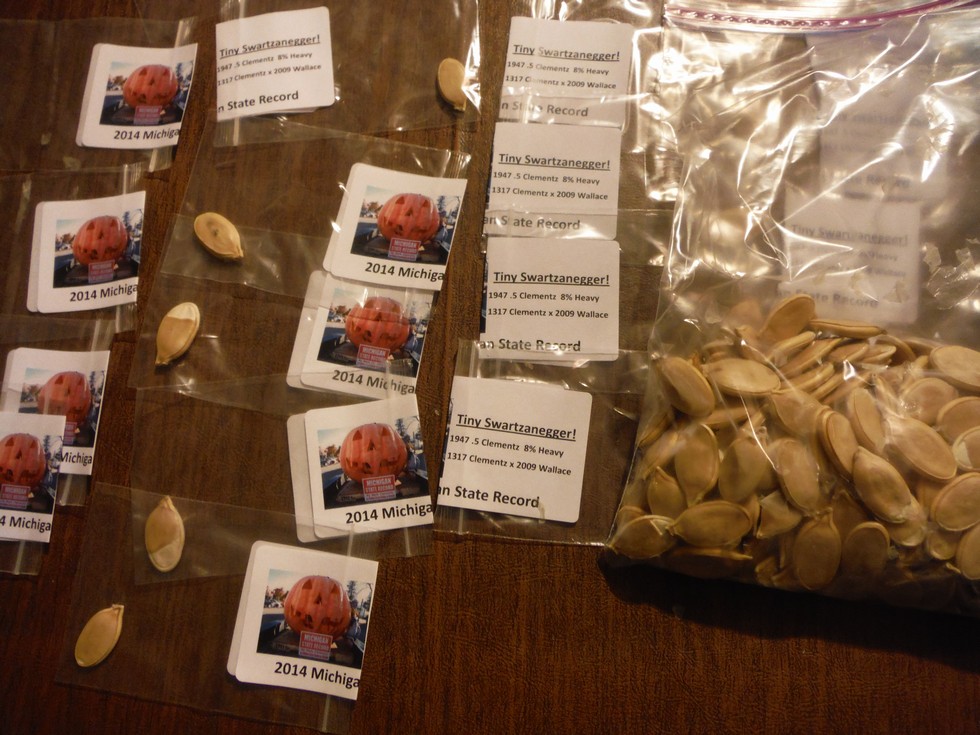 The last of the 1947.5s there were 580 viable seeds.The bag on the right contains the final 200.There are 19 packs on the table.So after shipping the Bubba Challenge seeds out 50 packs.Leaves about 170 after another 10 packs to by loyal friends in Canada & elsewhere.(160)Over 400 seeds passed out 1st year.This doesnt leave a lot for year 2.If you havent got one by now.There really tight now.You better have your pretty wife to ask for one.Cause I aint given 1 to know ugly guy.lol I really beleive this seed has a 2500 lber in it.Orange or creme or white is the mystery??Has anyone heard from Paul from Australia?? He was growing in last December?Dont you grow no ugly Pumpkin!They will ship Monday morning to awl growers worldwide.In fact I will do the overseas & Canada first.