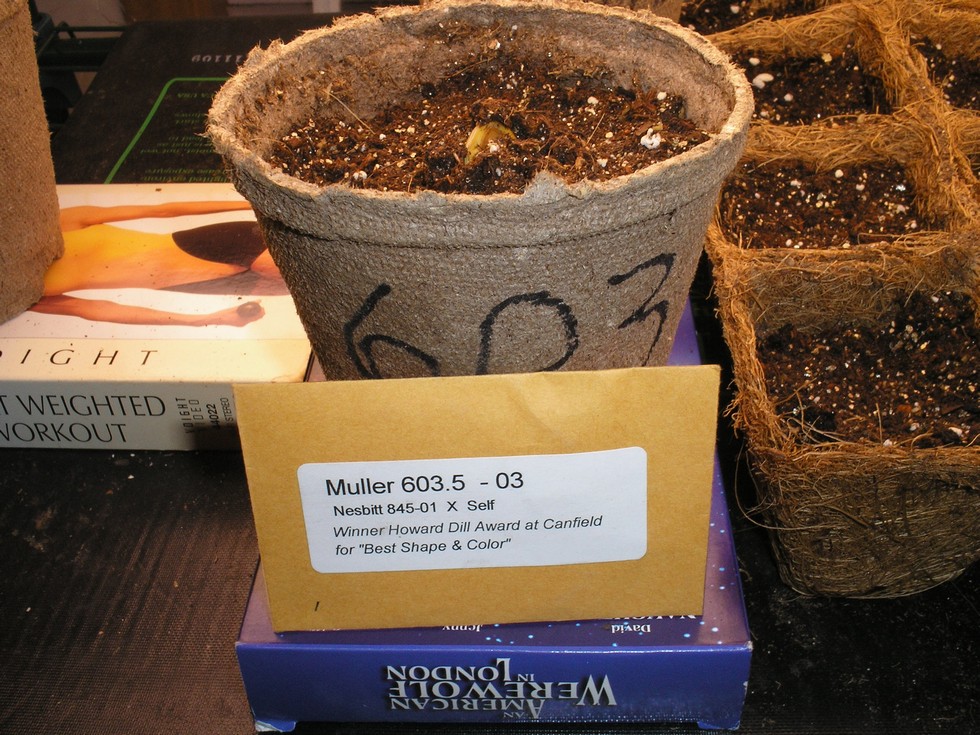 I got my 603 Muller from the MAGPG auction, Lot 17. Most of the seeds are past their expiration date. BUT the 603 has germinated and has broken the surface of the 4 inch pot. One can only hope for good things to happen all the way to show time.