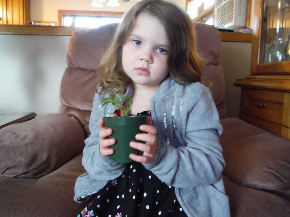 Brooklyn will be 5 in June.She brought Gramps this mater plant she was given at school and ask me to put in in the garden.If you remember she was my pumpkin model in 2012 with my 1478 Jackson Reed Pumpkin.That was my first 1000 lber.Shes shy & its 8 am so no smiles this morning.Brookler The lookler! On a separate note:Cold front came through temmps dropped 25 degrees high 60 today lows 40.I will try & plant the rest of my kins today or tomorrow,They are getting huge roots coming out of bags.