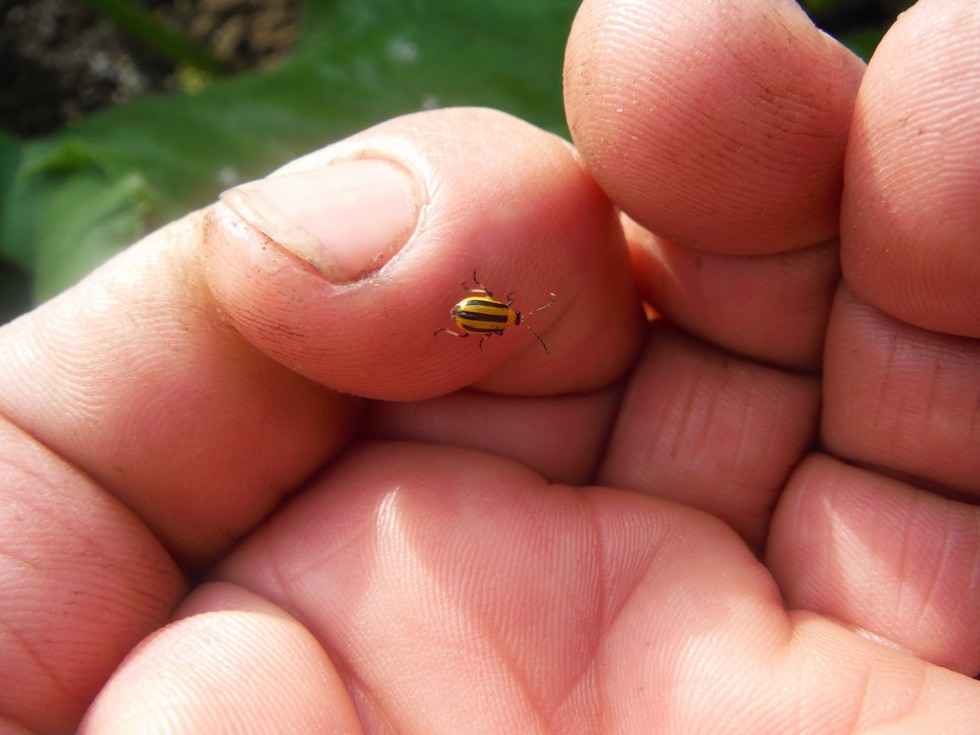 Danger Will Robinson Danger!On your daily walk through patch .You need to stop and look inside the new growth for cucumber beetles.I found a 1/2 dozen having sex on my 1363 Pugh squash plant.I immediatly stopped and read them the riot act.We will have ORDER!!No sex on my Squash!!lol You will find them inside the new growth,they love the tender new growth.The plant is treated with merit.I did find one dead.I went & got my bug killer and mixed 1/2 tsp to a qt of water.I keep this in the 8 track shack in the shade,for quick use.I smashed several by hand.I then sprayed the entire plant .letting the spray roll through the leafs.Marshal law is in effect .No cucumber beetle sex in Bubbas Patch!!