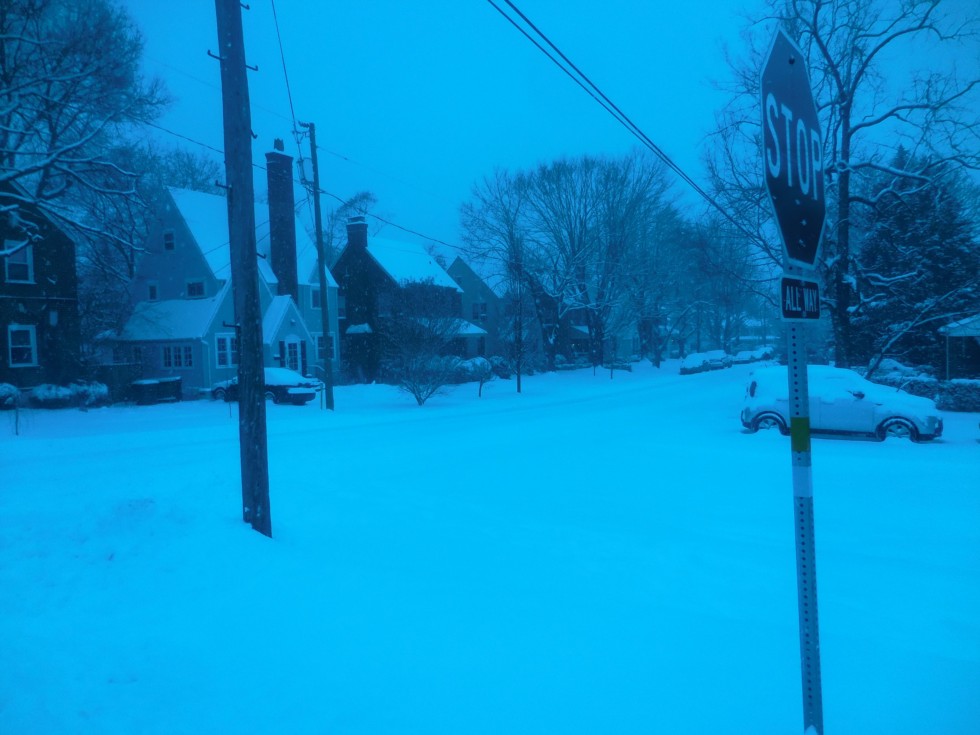 The snow is constant but not as heavy as earlier.Walking the block, I'm guessing maybe 10 inches.