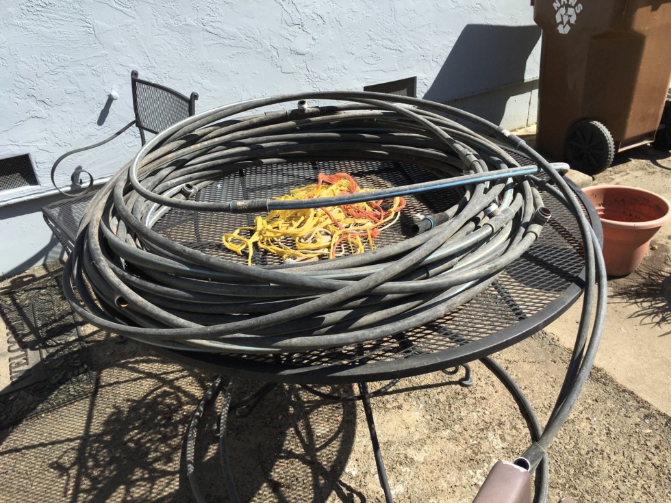 Out with the old, in with the new! We are redoing our watering, misting system. We have used this same hose for MANY MANY years. Some of our misters were too close to each other some were too far away. We had lowered our misters last year to around three feet to prevent evaporation. They were a bit too short. We will try and get it right this year! I think I will have to curtail my tennis fir the next couple of weeks while we get this all set up!