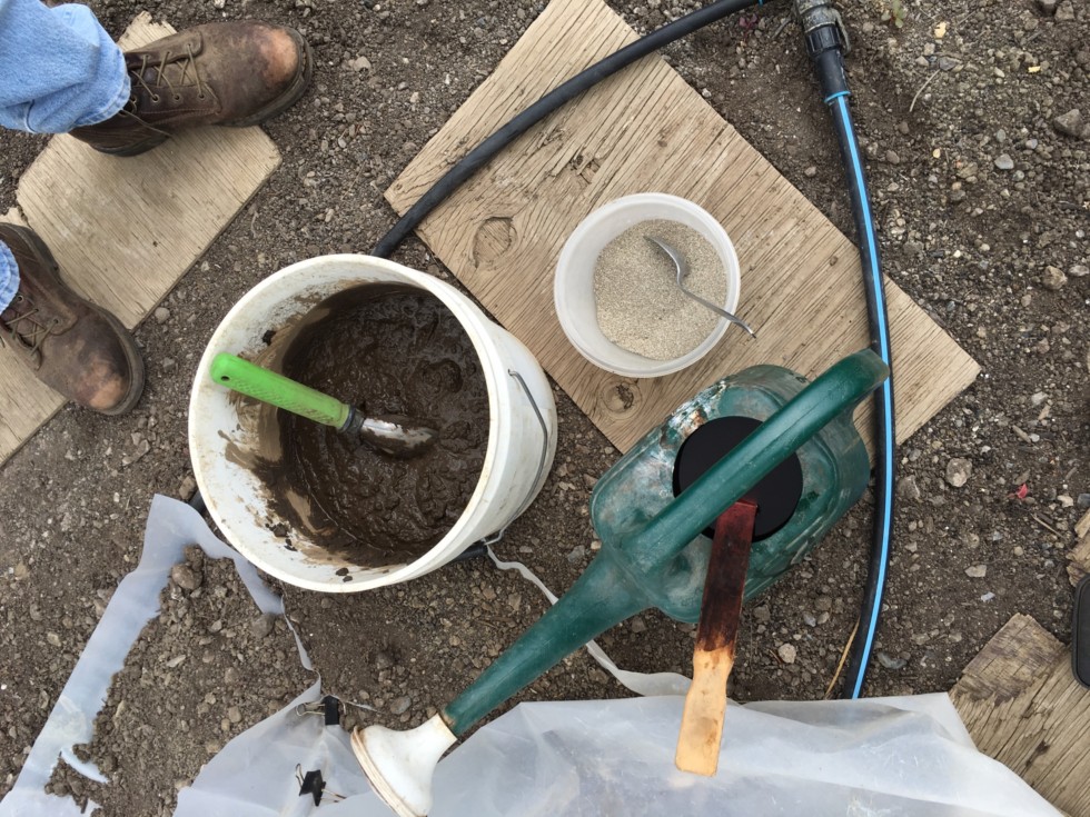 Off to work burying vines. This year we are using a concoction of seaweed, companion, silicate, azos and essential in our watering cans. Myco and root shield in the bowl. Dirt in the bucket mixed with water ....VERY LABOR INTENSIVE. But we did a similar system in 2014 when we grew the 2036.