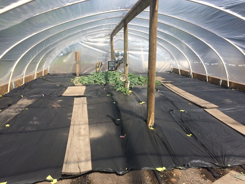 179 Crews watermelon. Growing fine. That thermometer is facing the sun, it's not quite that warm in there.