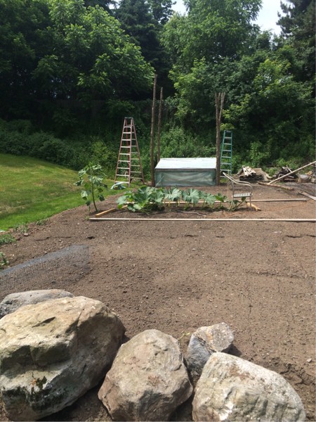 Whimpys plant got unleashed yesterday... Today's sweaty project?... Long gourd trellis...I had to use the hoop house to hold the legs up ... I tried it without it first with the misses but...well... Let's just say it was easier this way...