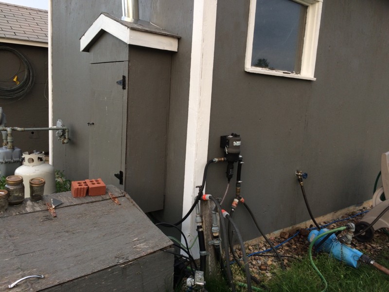 My water setup. Fert injector, cheap tankless water heater. I have two tanks connected to the pump. Everything's on an outdoor timer. If I have to, I can switch to well water. Some buried water lines run to the patches.