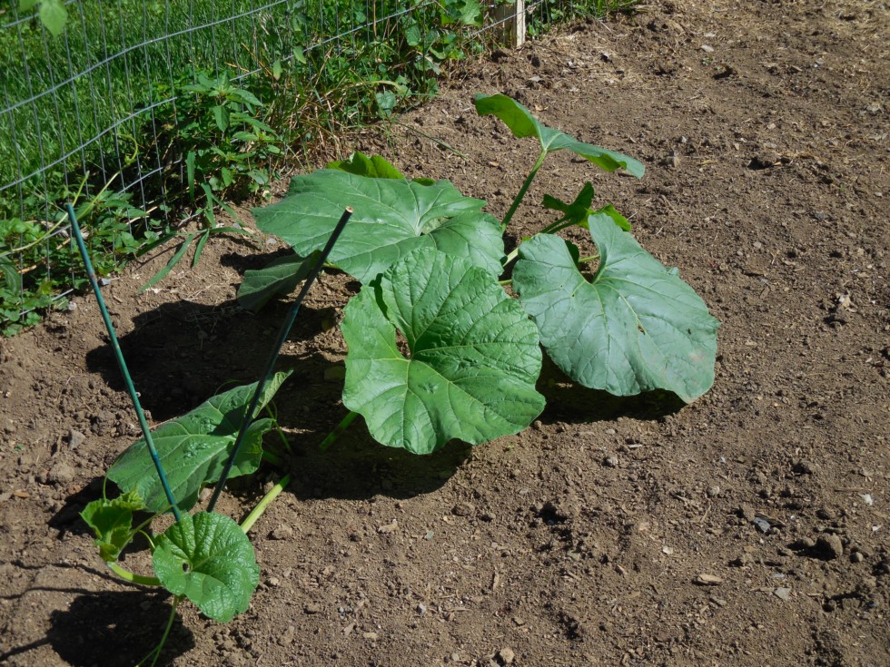 Trying to see if the long gourd will root up a little before we run it up the trellis.