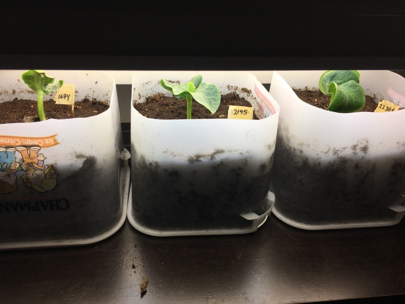 Here are the babies. I moved the light up and turned the heat up a bit. The 2230 had a strange curled leaf that was growing upside down. Unfortunately my efforts at modifying that behaviour were futile. I just manually moved it this morning. It'll be out of the way of the true leaves now.