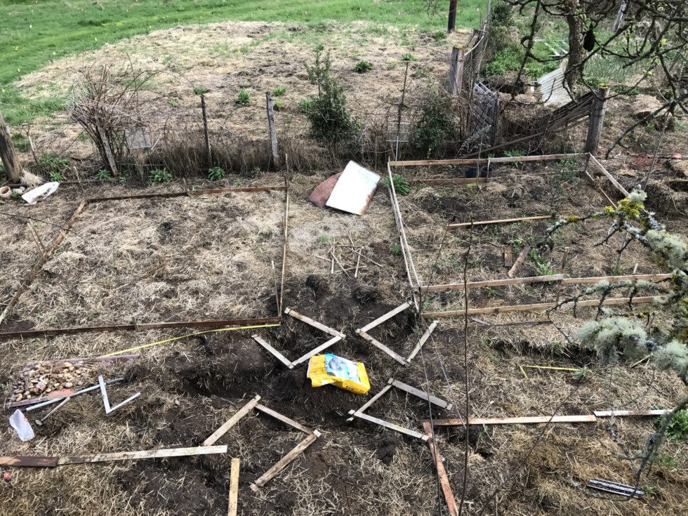 150 sq ft patch not quite ready. Four-leaf-clover layout... 3 or 4 plants will grow out from shared dirt & manure pile (to be created in the center at the location of the yellow bag). The short transit from where I will start the plants, one from each corner of the mound in the center, to the main patches, will be about three feet (an allotment of six square feet for this is seen roughly marked by the smaller boards). The main portion of each patch will each be 12x12 for the remaining 144 sq ft.