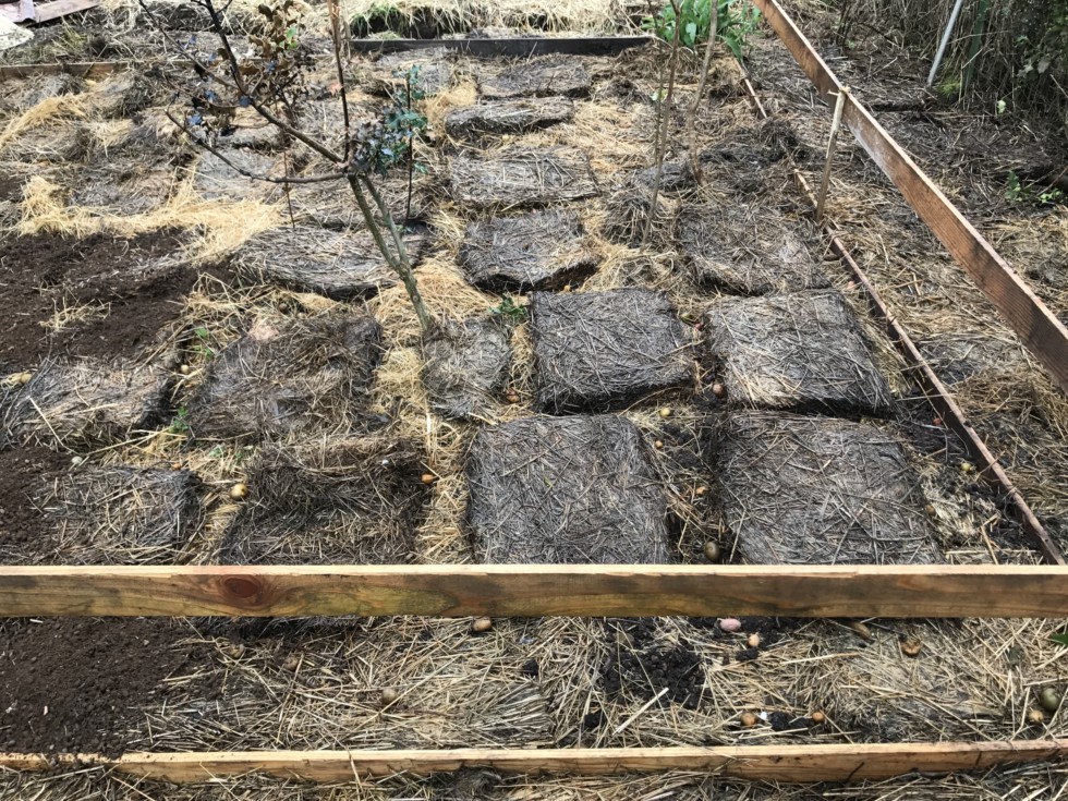 Old rotted hay flakes set out like tiles, soon to be covered with dirt.