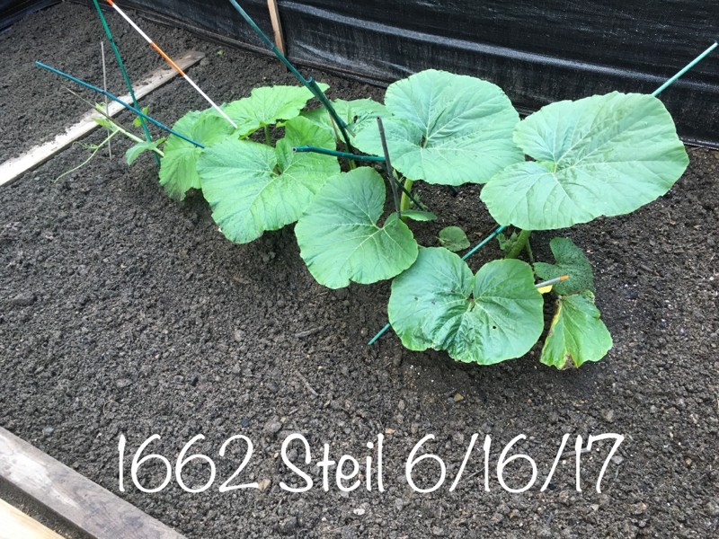 This is the plant that replaced our 1947 Clementz. She has quickly become a good grower and has her first baby pumpkin at the mains tip.