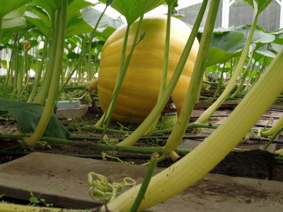 side view of the 1469 hopeful...also would like to give a big shout-out to Clint Nash, from the Utah giant pumpkin club for paying me a patch visit on his trip to Alaska , thanks buddy it was a good time , I definitely need to work on my long gourd trellis , after seeing pics of his..lol