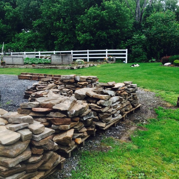 Rain rain , go away...too wet to work in the gardens today...but I finally got a chance to stack up all the rocks from chimney foundation...hey...I just noticed Lily rolling around in the neighbors dog crap...cool