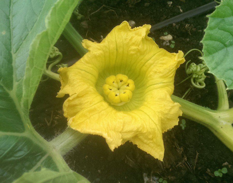 Here is a lovely looking 333 flower about 10 feet out on a side vine which I pollinated today using transplant pollen. This will be a backup in case the pumpkin on the main vine fails.