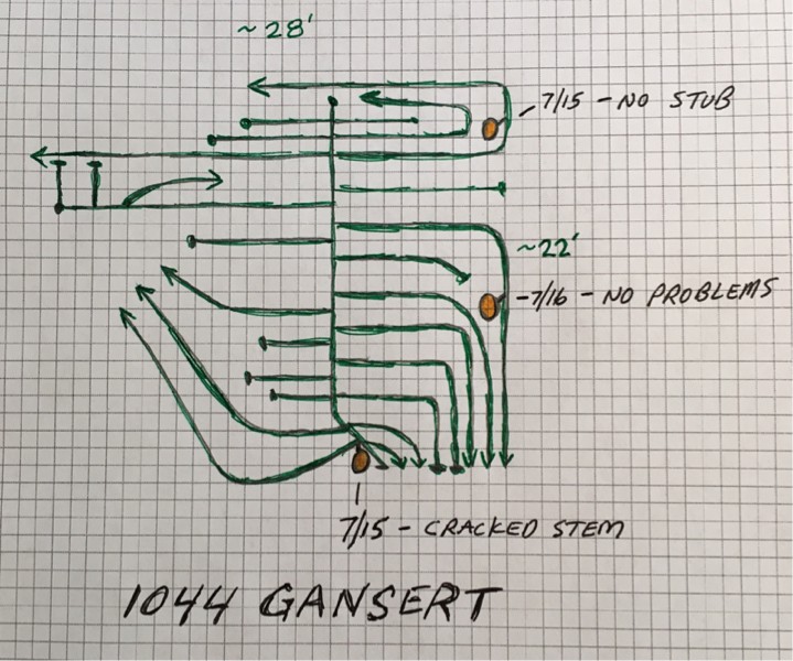 Drawing not to scale and just going off my memory of where the secondaries are. Vines not termed yet have arrow at the end. However, vines on right side and bottom side of pic are up to the fence already so they have no place to go really. Right now I think the kin labeled 7/16 No Problems is best looking kin and want to go with it.