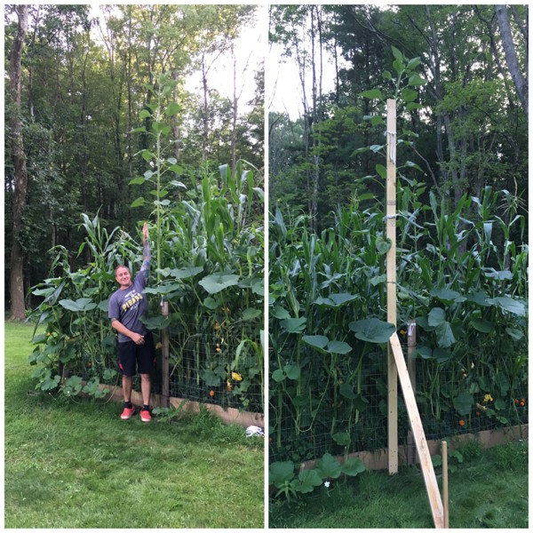 Seeds from Lee Zappa's 24.5" sunflower. My tallest one is just at 13' tall. The 12' 2x4 is way short of where it needs to be. Trouble is, I can't figure out how to get up there to add on and get the sunflower secured. My 6' stepladder only got me to around 10' up to tie it off.