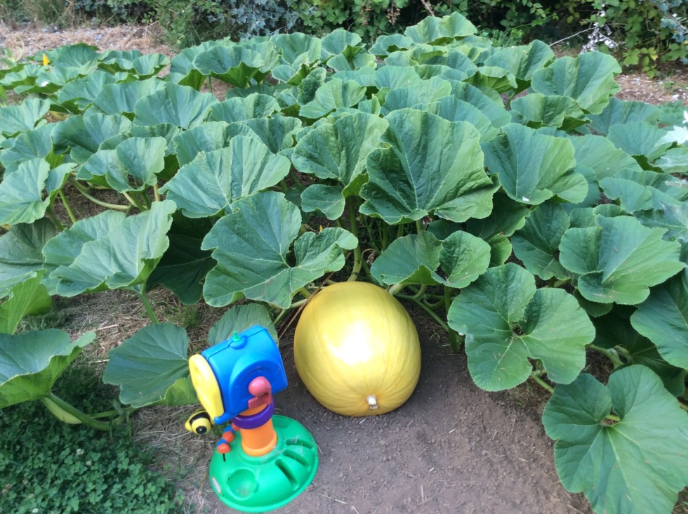 1462 Gibson vs traffic cone orange. Kids toy is about as orange as anything can be. Makes the pumpkin look yellow but I'm still impressed with the color. For a big pumpkin at twenty or twenty-five D.A.P. I don't think it gets much oranger than this. Not sure what this one measures but all of my plants are well under 20 lbs per day.