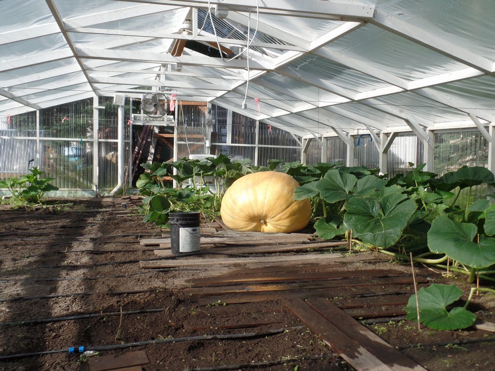 another look at the 1469B pumpkin , this plant wasn't even suppose to last this long , the plan was to prune it way back as the 2145 took off, another reason why I cram 2 plants in each gh , so if there problems with the chosen one , I still have something for the fair