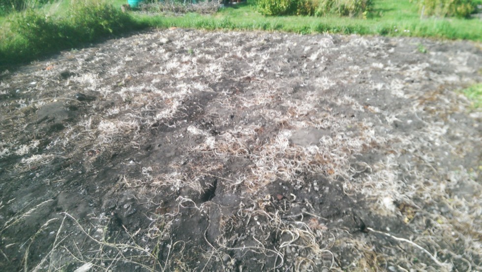 We've had the new plot covered in black sheeting for several months now to weaken all the weeds underneath. As you can see everything is dead apart from loads of etiolated bindweed. This stuff is very difficult to eradicate and the plot is covered in it. I'll let the weed seeds germinate and allow the bindweed to recover for a few weeks... and then nuke it all with glyphosate. After that I'll start conditioning the soil for winter.
