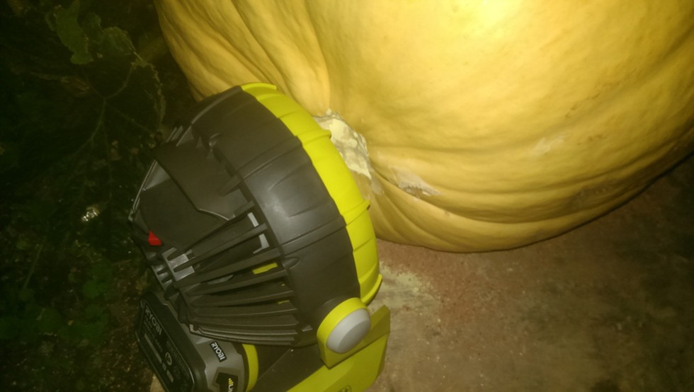 If it wasn't for the internet I wouldn't have been able to order this rechargeable battery-powered fan last night and have it delivered today. A couple of hours charge and here it is at work drying out the blossom end of the 333. It says it will run for 18 hours straight so I will run it overnight, recharge for 2 hours, then get it out there again. I hope it does ok because we have rain forecast for tonight and tomorrow. Both it and the pumpkin are under a tarpaulin rain canopy.