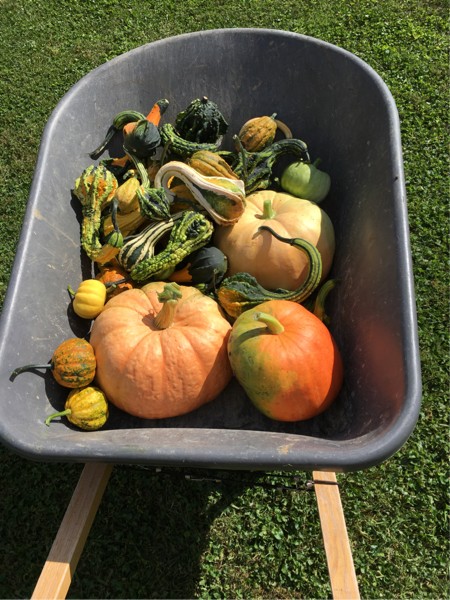 Every year we throw our various decorating pumpkins and gourds in the tree line. Not a bad harvest for zero watering, and maybe two sprayings.