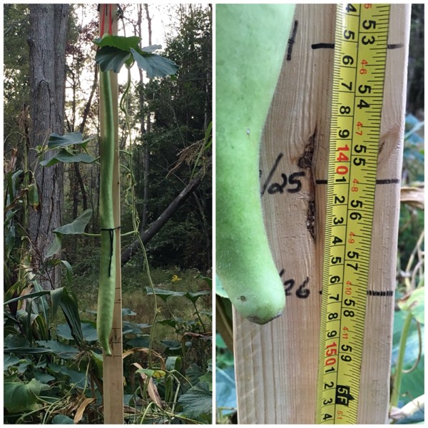 Our other long gourd rotted so now we�re watching this one grow. Doing about 2.5�-3� per day since I tied it up to this 2x4. I�ve been marking the daily growth on the board.