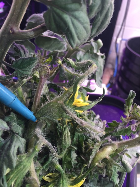 It is really hard to get a picture of what I am seeing. This plant has one big ribbon blossom coming out. The point of the pen shows where the flower starts. I am thinking this blossom is going to be difficult to get set. Leaf and vine growth is very deformed.