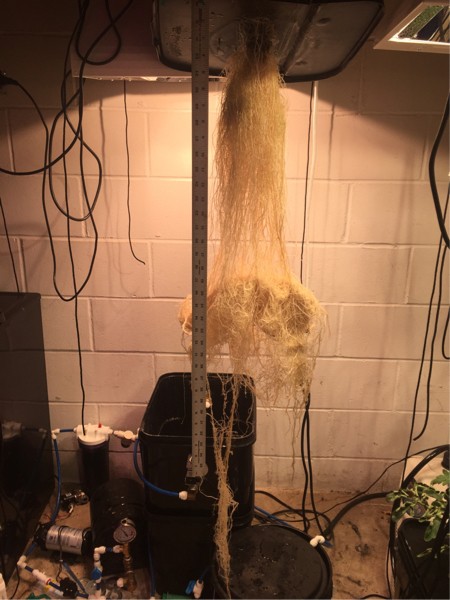 The aeroponic root system. You can see how the roots grew until they hit the bottom of the 13 gallon container and intertangled . I combed some of the roots out..they are well over 6 ft long. Also noticed there are no really thick feeder sections.