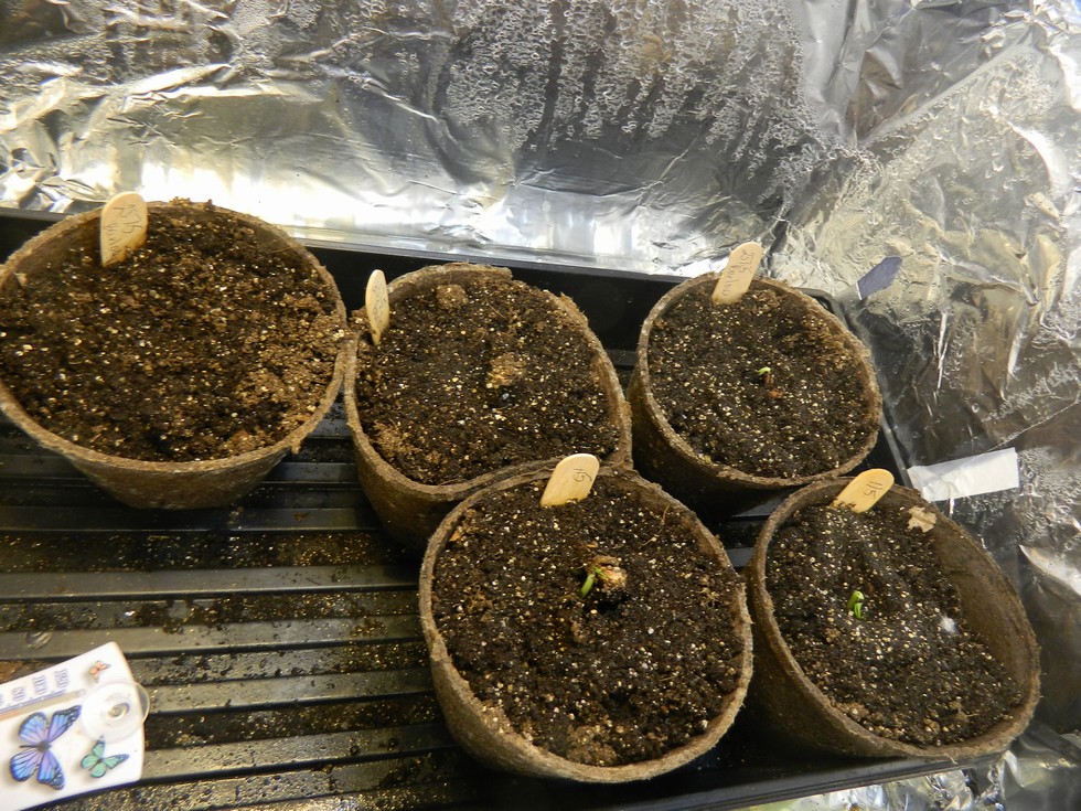 Starting to get some watermelons to pop up. 2 of the 257.5 Barlow and 2 of my 115, which is 2 generations of self/sib pollinations of a 260 Clementz. I tried starting some about 10 days earlier, but germination was slow. Then a mouse got under my grow light setup and ate them off. My daughter's cats failed their jobs. These will be grown out longer in bigger pots before going to the garden. Looks like I might have to gently remove some seed coats, even though I filed the edges. I guess I didn't file off enough.
