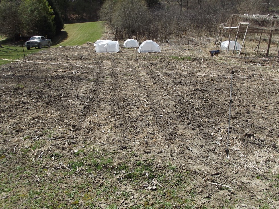 This is a 2 pumpkin plot that will get a break this year. I marked out 4 sweetcorn rows in the middle. The ends where next year's pumpkins will go have been seeded to mustard. After the mustard is tilled in and rested 3 weeks for the bio-fumigation, it will be covered with compost and planted to rape and radishes. After the sweetcorn is harvested, the stalks will be cut for compost, it will get a shot of compost and planted to mustard. That area will get the rape cover crop early next season.