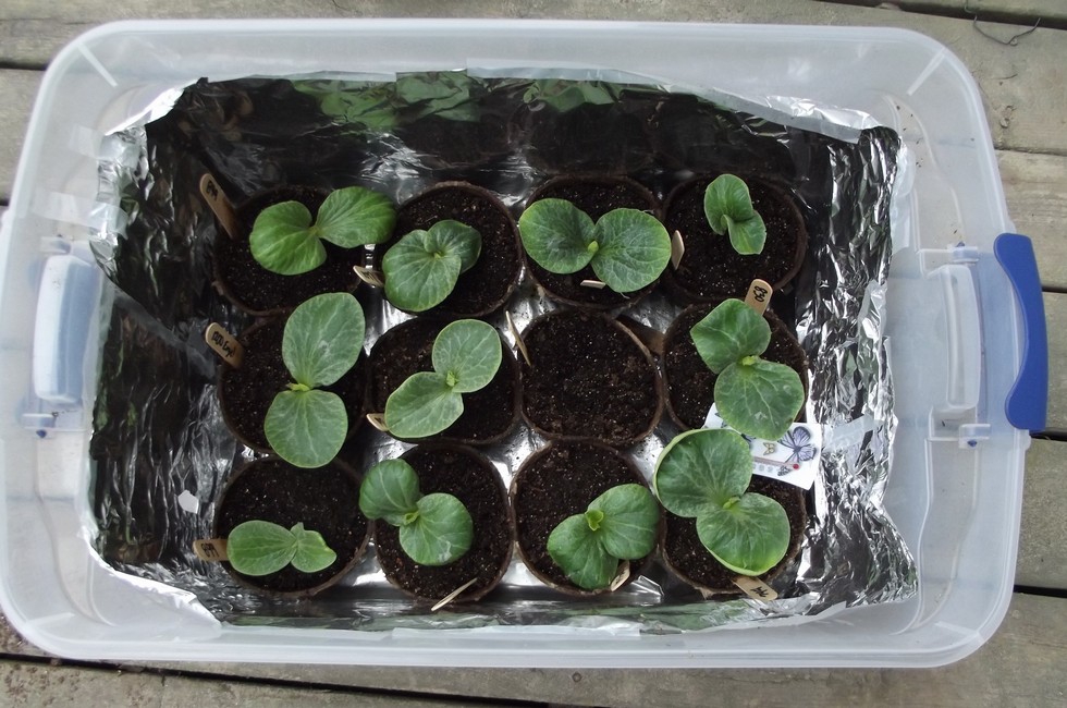 11 out of 12 germinated; 6 for the patch and 5 back-ups. The babies got some outside time yesterday and spent the night outside. Rain is coming and I have to be gone for a while. So they will go in front of a window with 2 fluorescent grow lights across the top of the box. Won't be long and they go to the garden. I need the box for gourds and field pumpkins.