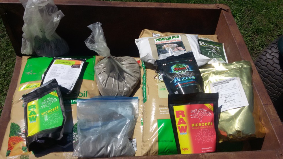 Planting day, throwing all my biologicals from last year at them. It may be all dead who know but it's going in the hoops. Then watering it in with compost tea. Good luck everybody..