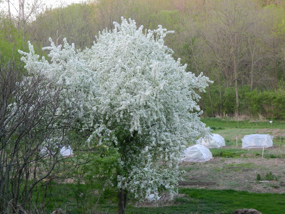 View I am getting when walking down to the garden. Siberian crabapple puts on a good show for about a week each year. The pumpkins have not been liking the 80 degree weather. Usually it is a little cooler when I set them out. Put they were hardened off and get watered daily and are growing. We gave spares in 2 gallon pots if needed.
