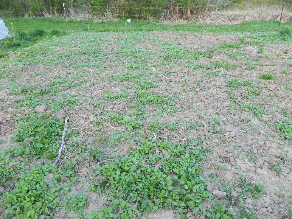Mustard cover crop growing, along with a few weeds. Just broadcast on untilled soil ahead of a rain. This is a spot where we lost 2 pumpkins last year. It had a fall cover crop of rape and radish.
